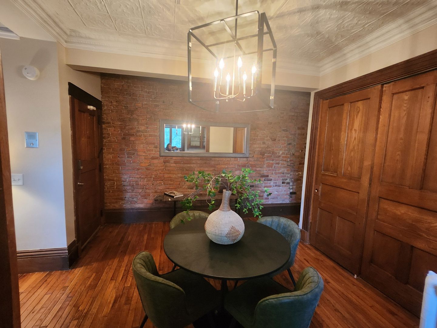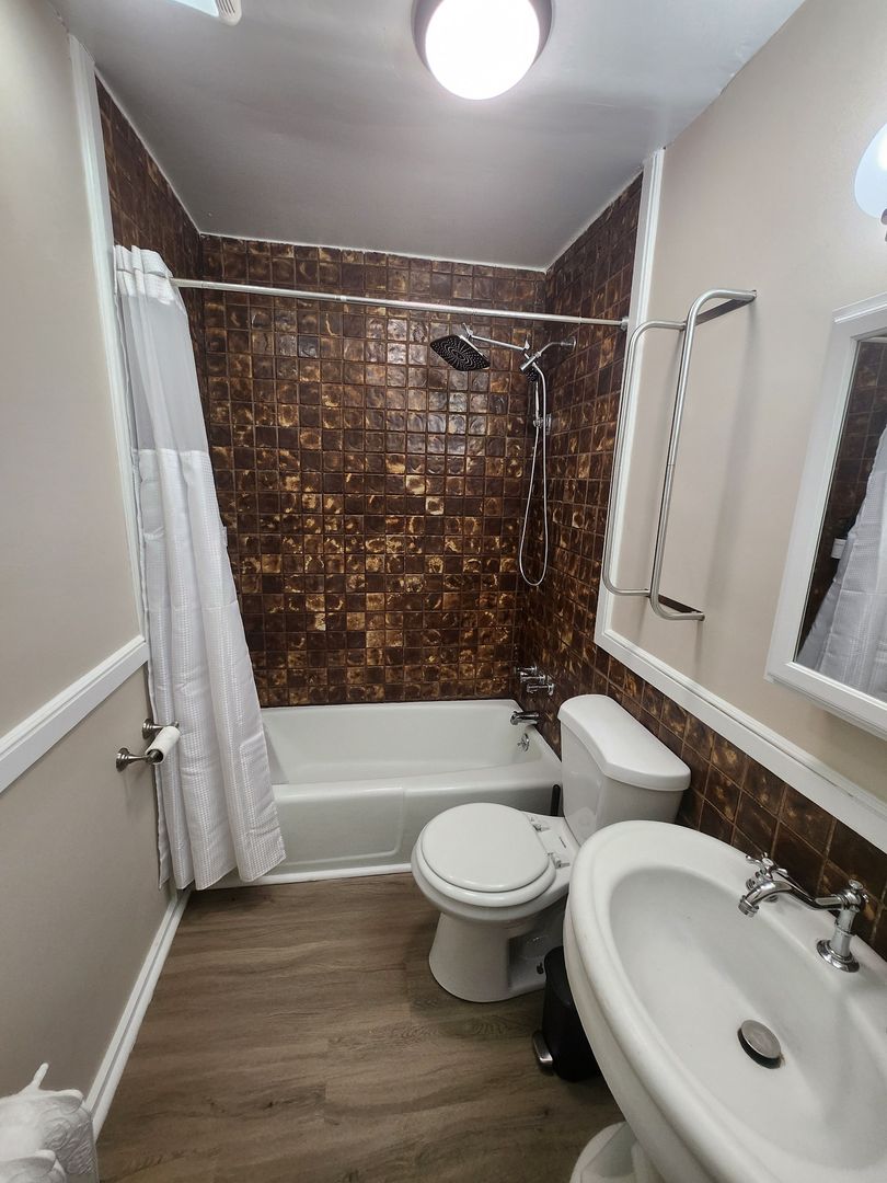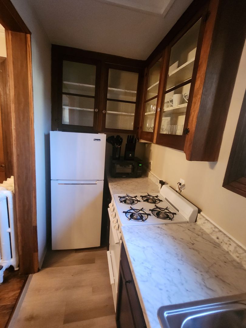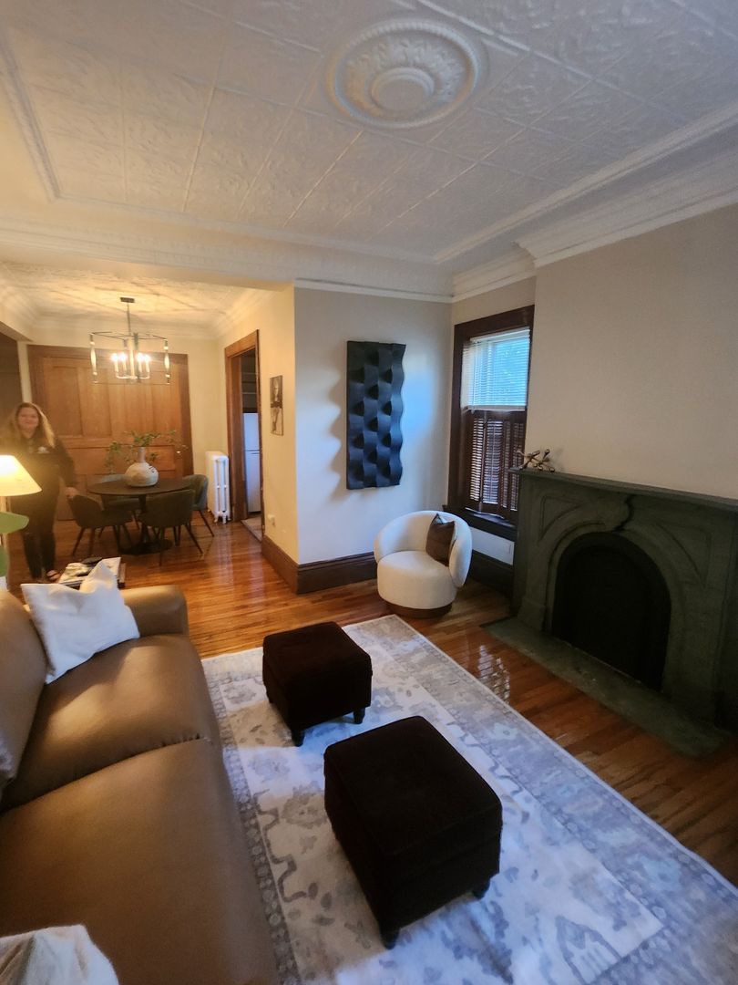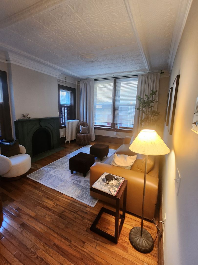 Discover this spacious 1-bedroom apartment, ideally situated in a vibrant neighborhood with everything you need at your doorstep. Boasting beautiful hardwood floors throughout, this unit offers a bright and airy living room, highlighted by four large windows that flood the space with natural light. The living area also features a decorative fireplace and an eye-catching exposed brick wall that adds a touch of character.