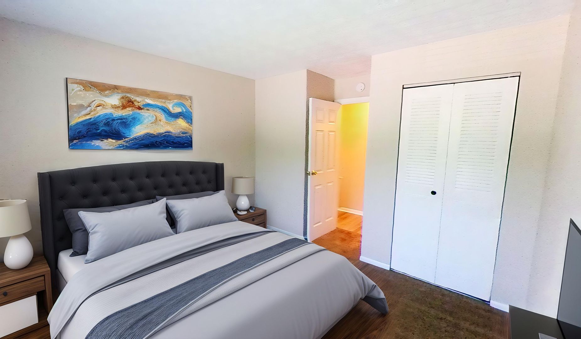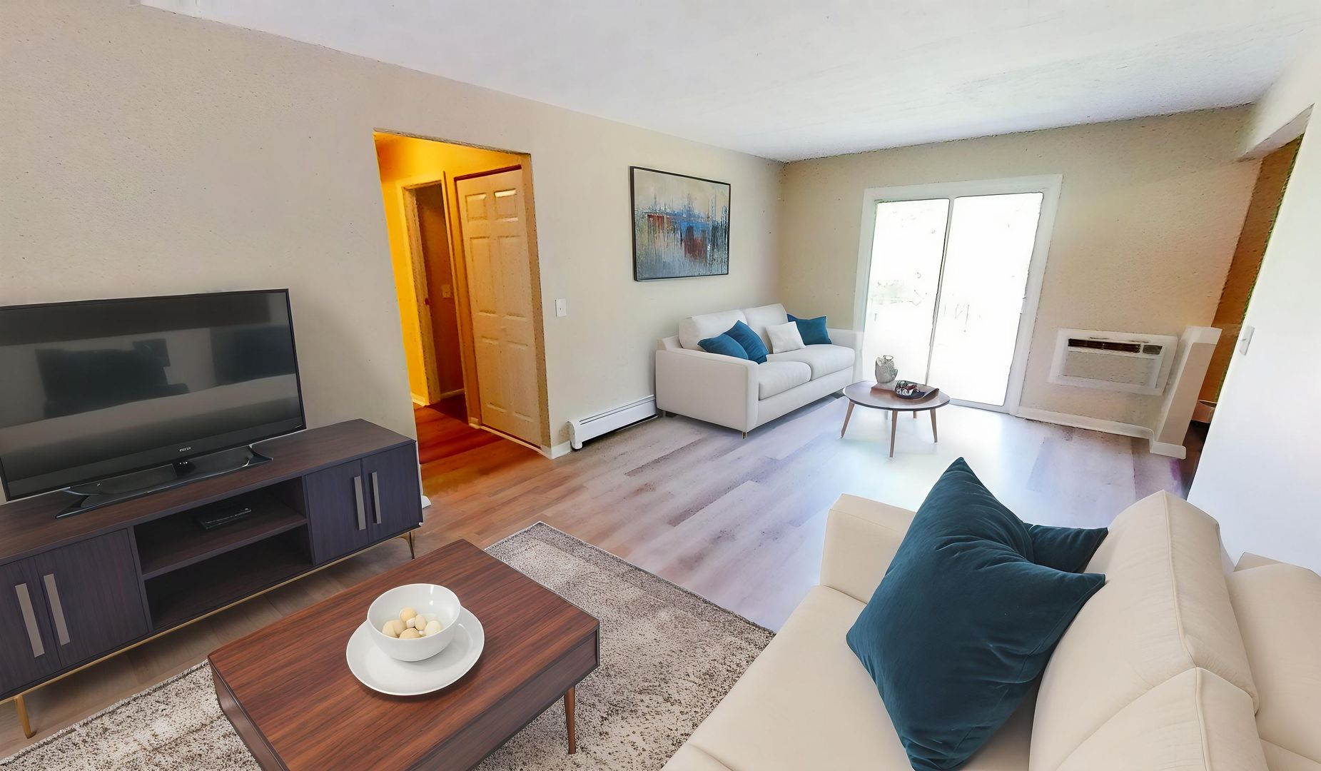 This is a beautiful freshly renovated two-bedroom apartment. The living room is very spacious with gorgeous wood-style floors and features a brick accent wall and a ceiling fan! The kitchen has an area that would be perfect for an eating area. This apartment has ample space, large sliding doors, and a patio located in a quiet and park-like setting making the apartment a perfect getaway from your day-to-day.